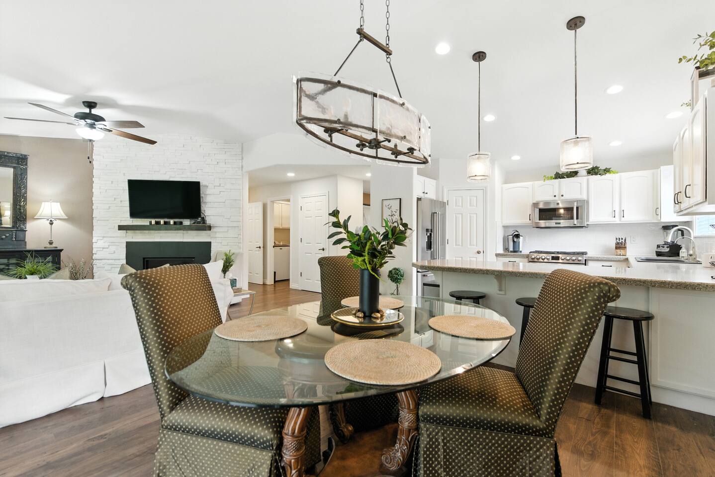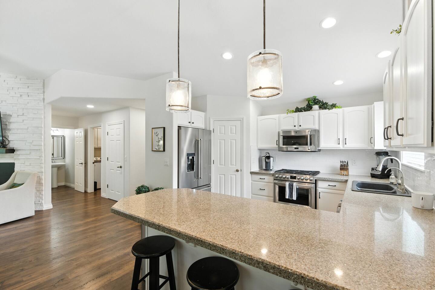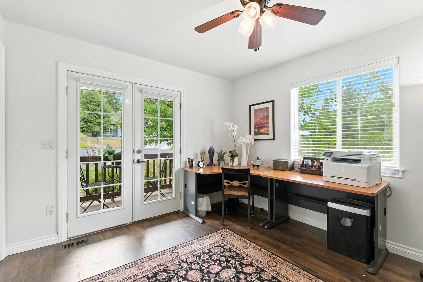 Designed with comfort and ease in mind, every detail is ready for your stay: · 3 bedrooms, thoughtfully styled with quality bedding · 2 bedrooms double as an office/gym · 2 full bathrooms with all the essentials · 1 half bathroom off the main living area · A chef’s kitchen, stocked for everything from morning coffee to full family meals · Open-concept living + dining space with plenty of natural light · Fenced backyard with patio seating, grill, and space to unwind The Bedrooms Each bedroom offers cozy touches, natural light, and restful vibes: · Primary Suite – King bed, en suite bathroom · Second & Third Room – Queen bed with soft linens and ample storage · Fourth Bedroom – Twin Bed, Daybed Style, with small gym · Fifth Bedroom – Full size murphy bed, full size desk with french doors to the front porch Location Perks Tucked into the hillside but still convenient to everything: · 8 minutes to downtown Coeur d’Alene’s shops, dining, and lakefront · Easy access to hiking and biking trails right from the neighborhood · 10 minutes to Tubbs Hill and Sanders Beach · Quick drive to Silverwood Theme Park (25 minutes) ✅ The Perks · Super-stocked kitchen with cookware, bakeware, and spices · Smart TV and fast WiFi · Washer + dryer · Free parking in driveway · Quiet neighborhood for restful nights ⚠️ The “Hey, Just So You Know…” · The home is in a peaceful hillside neighborhood — you’ll need a car to get around · The yard is fully fenced, but not pet-proof for tiny dogs