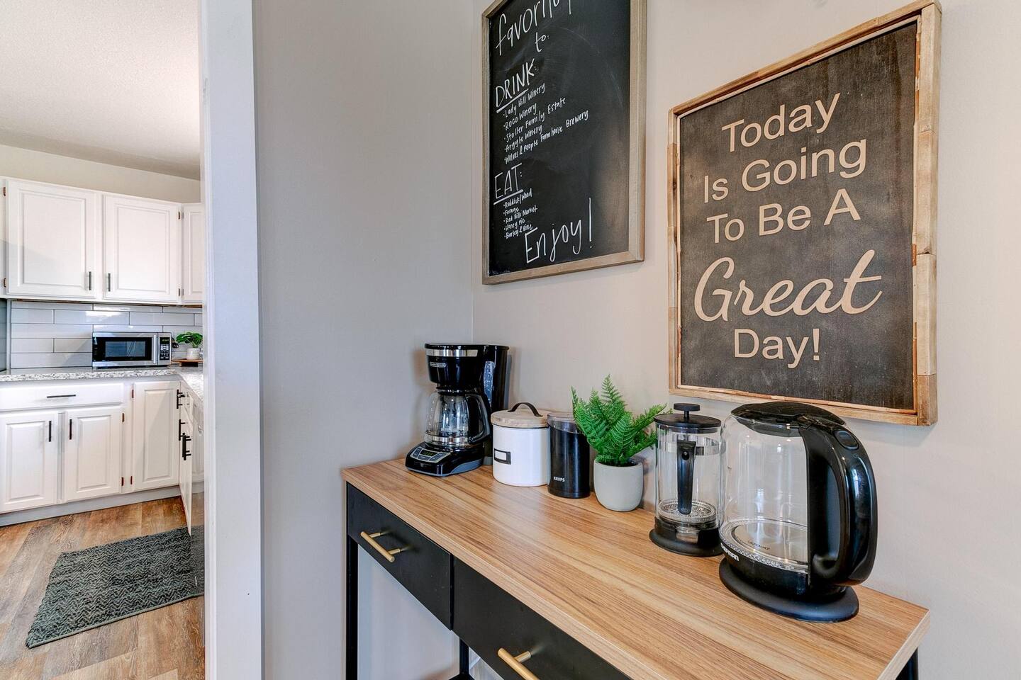 Coffee Coffee is provided. There is a coffee grinder, a French press and a hot water kettle, and a coffee maker to make the perfect cup of joe. Fire Wood for the Fire Pit Wood for the fire pit isn't provided but is available at local stores.